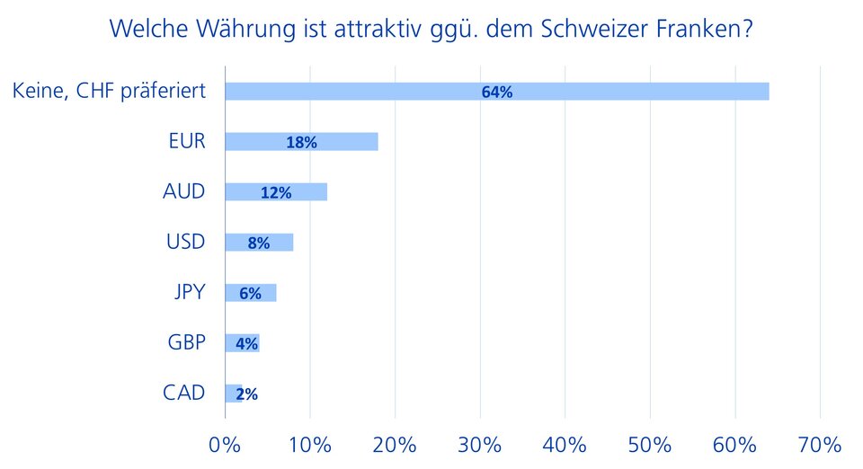 64% der befragten CIOs erachten den Schweizer Franken als die attraktivste Währung (siehe Abbildung 5). Dies trotz einer bereits starken Aufwertung in diesem Jahr. Das unterstreicht seine Rolle als «sicherer Hafen». Bei den Fremdwährungen werden insbesondere der kanadische Dollar und das britische Pfund als unattraktiv angesehen, während der Euro aktuell als beliebteste Fremdwährung gilt.