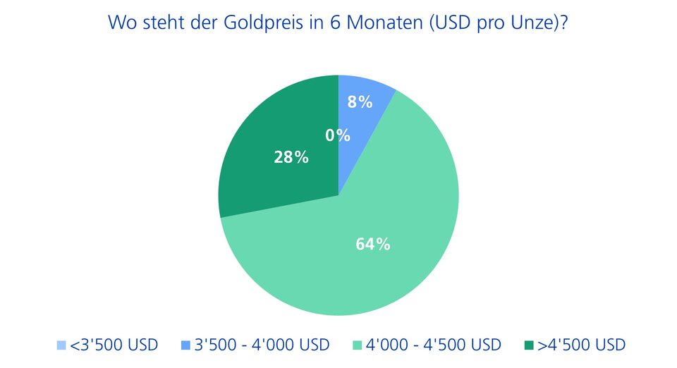 Die Umfrageergebnisse zeigen, dass trotz einer Verdopplung des Goldpreises innerhalb von zwei Jahren nur 8% der befragten CIOs von einem sinkenden Goldpreis in den kommenden sechs Monaten ausgehen (siehe Abbildung 1). Bemerkenswert ist zudem, dass keiner der befragten Expertinnen und Experten Gold in den Portfolios untergewichtet, und niemand einen Preisrückgang auf unter USD 3'500 pro Unze erwartet. Im Gegenteil: Fast ein Drittel der CIOs rechnen mit einem erneuten starken Preisanstieg auf über USD 4'500.