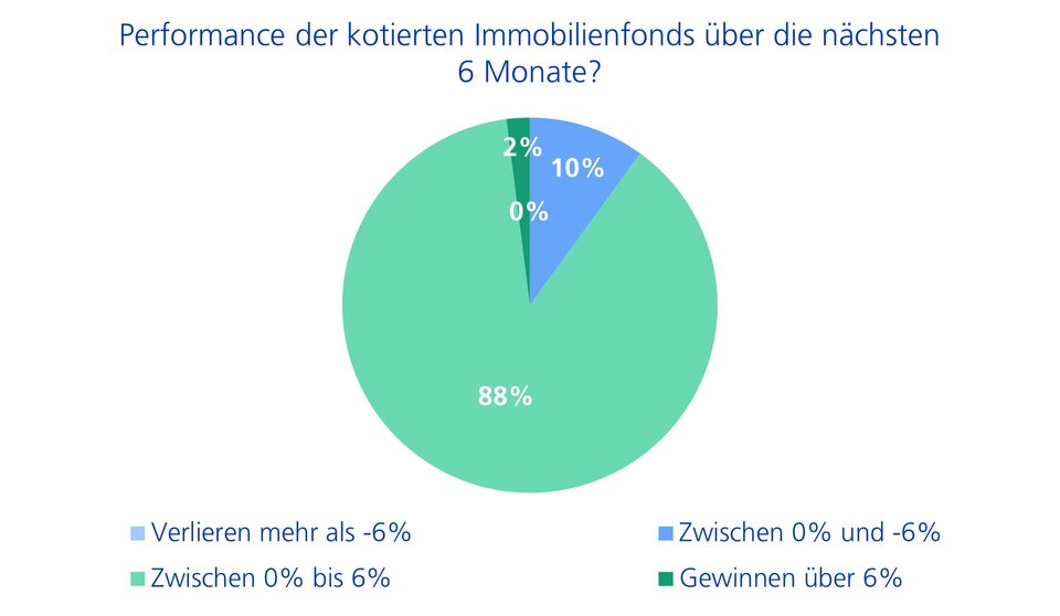 Ein ähnliches Bild zeigt sich bei den kotierten Schweizer Immobilienfonds (siehe Abbildung 2): Trotz hoher Agios (Aufpreis zum inneren Wert Net Asset Value) von über 35% gegenüber dem Buchwert erwarten fast 90% der Befragten eine moderate Performance von 0 bis 6%. Lediglich 10% der CIOs gehen von sinkenden Preisen aus.