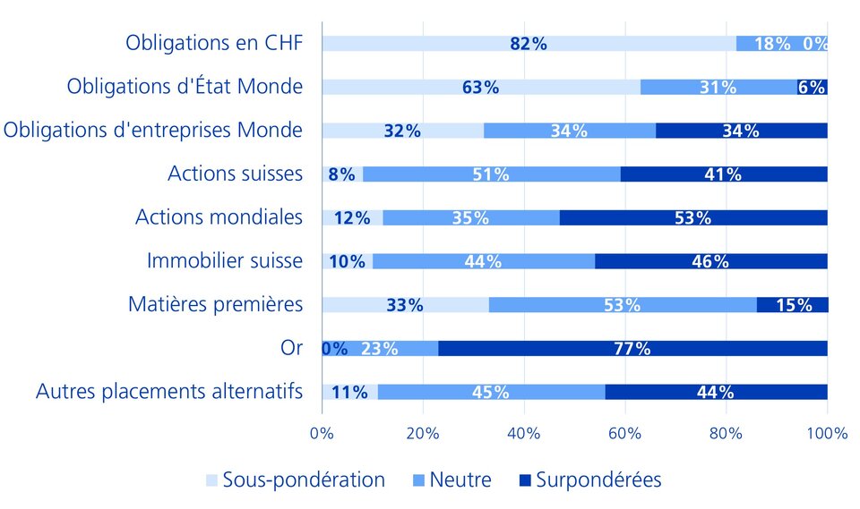 Les actifs réels tels que l'or, les actions et l'immobilier sont nettement plus demandés que les obligations. Toutefois, l'unanimité autour de l'optimisme pour l'or appelle à la prudence et pourrait être interprété comme un signal avant-coureur d'une éventuelle correction. Dans l'ensemble, le sentiment général parmi les CIO suisses reste optimiste, sans signe d'euphorie excessive.